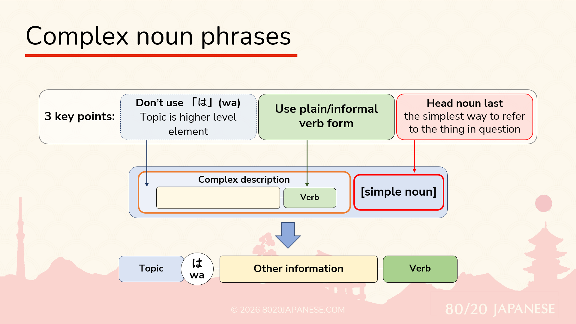 For this, we need complex noun phrases, and mastering these will hugely increase your ability to express yourself in Japanese.