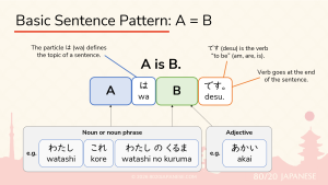 - How Basic Japanese Sentences Work: Understanding the Basic “A wa B desu” PatternIf you’re just starting to learn Japanese, understanding basic sentence structure is your first critical step. Fortunately, Japanese sentences follow incredibly logical patterns once you know what to look at. In this lesson, we’ll break down the most fundamental sentence pattern in Japanese: A wa B desu.A は B です。 This how we say “A… Read more: How Basic Japanese Sentences Work: Understanding the Basic “A wa B desu” Pattern